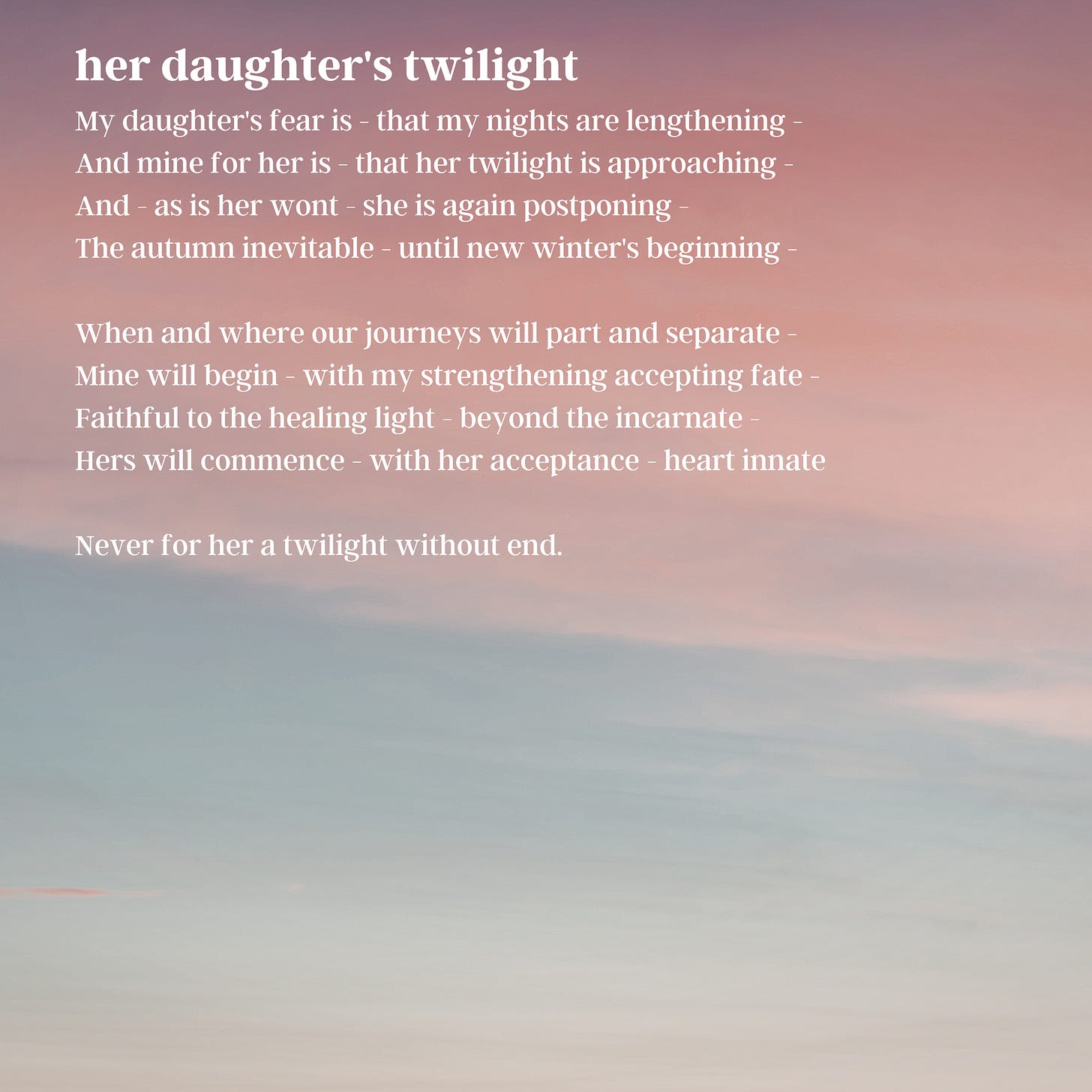 My daughter's fear is - that my nights are lengthening - And mine for her is - that her twilight is approaching - And - as is her wont - she is again postponing - The autumn inevitable - until new winter's beginning - When and where our journeys will part and separate - Mine will begin - with my strengthening accepting fate - Faithful to the healing light - beyond the incarnate - Hers will commence - with her acceptance - heart innate Never for her a twilight without end.